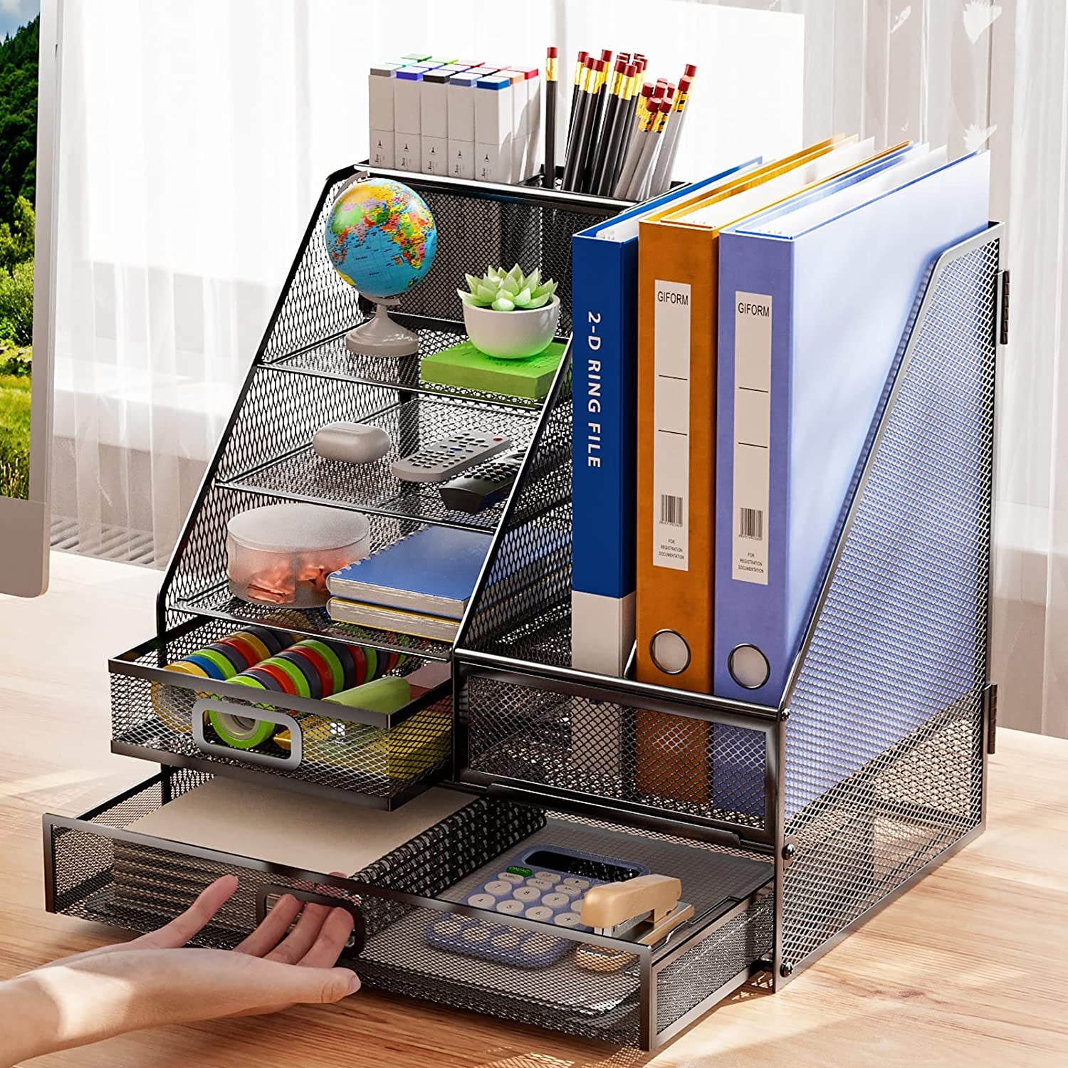 đăMultifunctional Desk organizerăHaving the Marbrasse desk file organizer can be such a productive addition to your office. With its 4 sliding trays + 2 magazine holders + 2 drawer organizers and 2 pencil holders, it offers plenty of space to keep all your office supplies and documents organized and easily accessible. With everything in its place, you can work more efficiently and with greater focus.