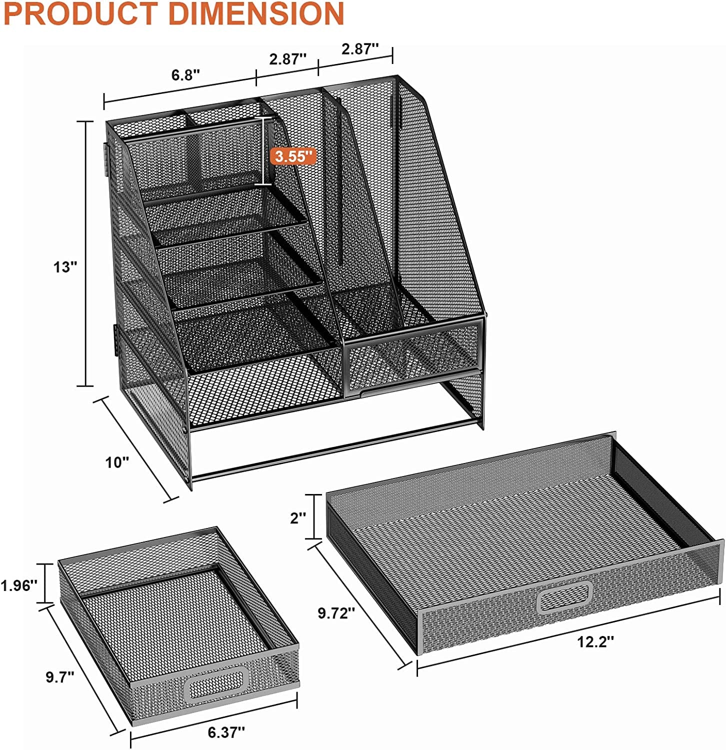 đăPractical DesignăThe vertical file holder can hold all your documents, papers, books, and magazines, while the paper tray is perfect for storing letters, mail, notebooks, and so on. It also comes with two different-sized drawers to accommodate all of your desktop accessories and it has 2 compartments for pens, pencils, and scissors. With a size of 12.5*13*10 inches, This desk organizer is compact enough to fit on your desk without taking up too much space.