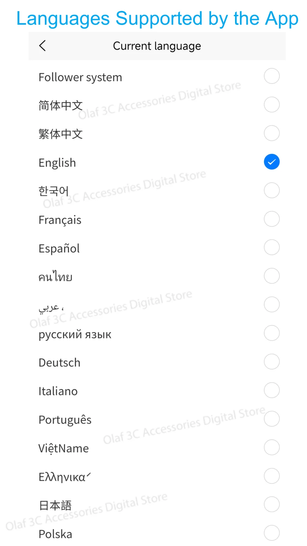 8:Languages Supported by the APP: English, French, Spanish, Korean, Thai, Arabic, Russian, German, Italian, Portuguese, Vietnamese, Greek, Japanese, Polish, Simplified Chinese, Traditional Chinese.